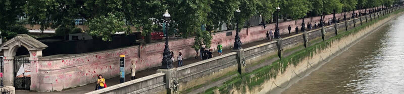 The riverside road here was Fore Street which was effectively destroyed by the building of the Albert Embankment. The embankment was built out of the original shoreline in 1866-9 under BAZALGETTE to take the southern low-level SEWER from Putney. Bazalgette's Assistant Engineer, John Grant, was supervisor, the contractor was William Webster and it was opened in 1868. It was named after Prince Consort. The embankment itself is a grey granite wall – apart from a short concrete section.