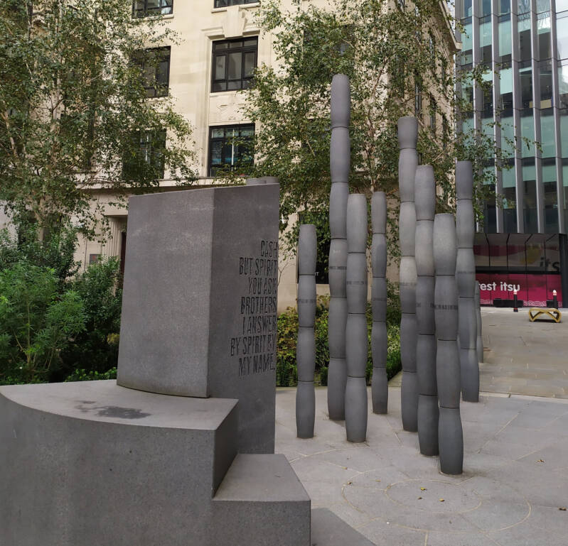 The sculpture commemorates the abolition of the transatlantic slave trade in 1807 and is a collaboration between sculptor Michael Visocchi and poet Lemn Sissay, the words being an extract from his poem 'The Gilt of Cain'. It was unveiled by Archbishop Desmond Tutu in 2008.