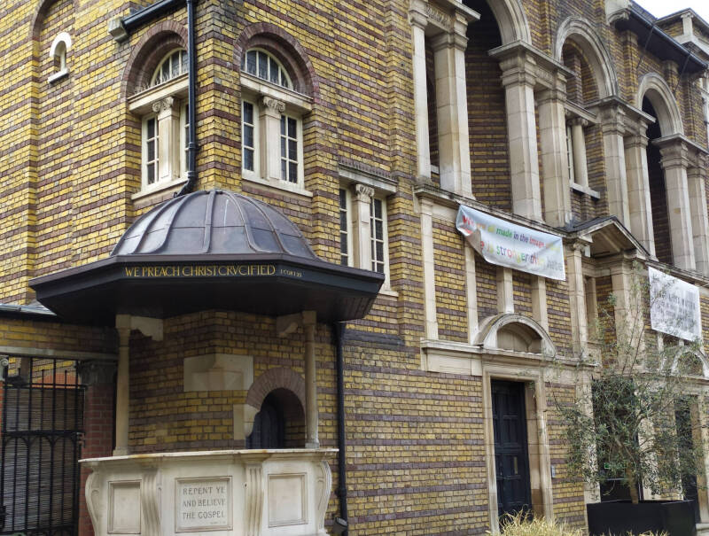 From the info boards attached outside the N wall of. the church: “St Mark’s Church took two years to build and was opened by the Archbishop of Canterbury on June 30th 1824. One of the Waterloo churches, the cost of £15,274, was paid by a government grant in gratitude for the defeat of Napoleon. Between 1879 and 1889 the vicar was the historian H. H. Montgomery, father of Field Marshal Montgomery of Alamein. At that time there were 16,000 people in the parish. It was staffed by the vicar, three curates and 250 church workers. 1,500 children were taught in the Sunday Schools by 125 teachers. The church was restored in 1931 at which time the glass dome was installed. Bombed in September 1940, it was scheduled for demolition. However, Wallace Bird, a man of vision and faith, became vicar in 1947. The building was partially re-opened in 1949 and fully opened on 12th March 1960. Today this church is used for worship and mission by hundreds of Christians each year.