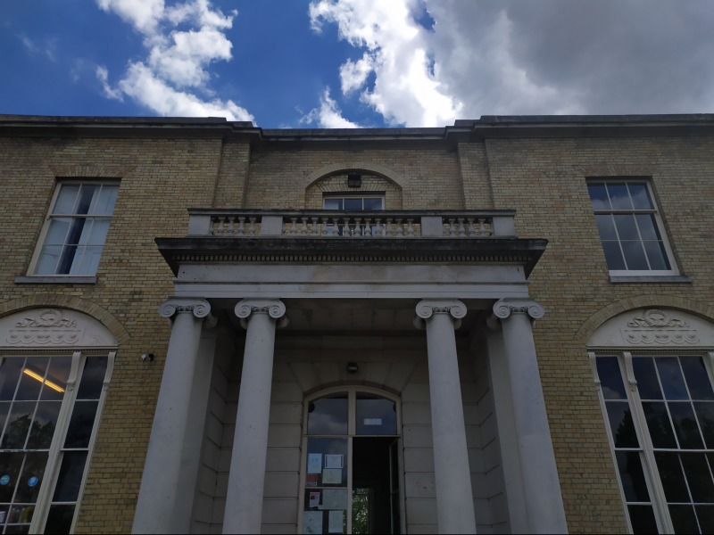 Built 1811-13 (Georgian, plain Free Grecian style) for JOHN BLADES, London glass manufacturer. This would be his country seat, and the centre piece of his estate.