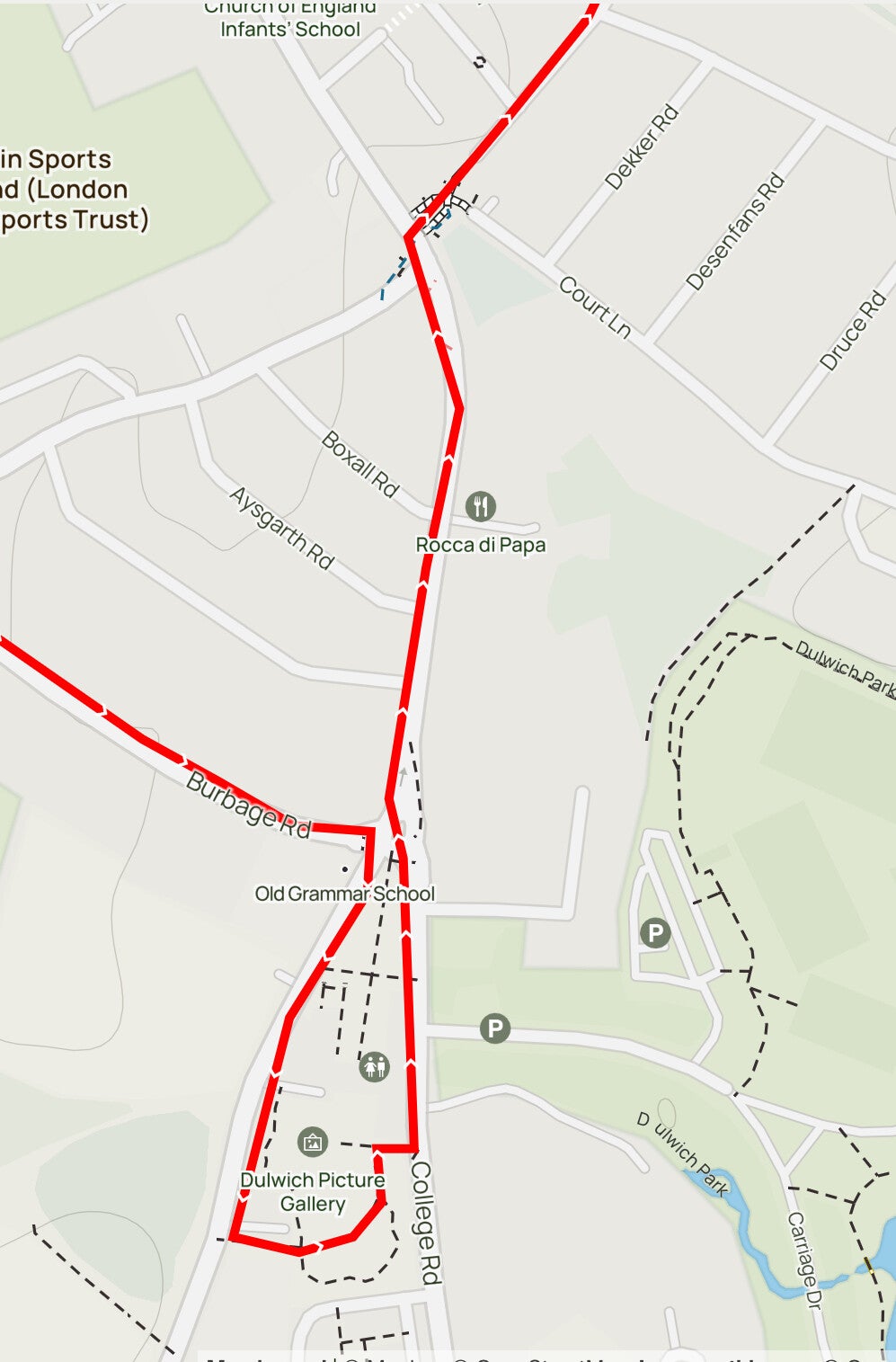 From DULWICH VILLAGE S of the PICTURE GALLERY and on to DULWICH COLLEGE towards CRYSTAL PALACE