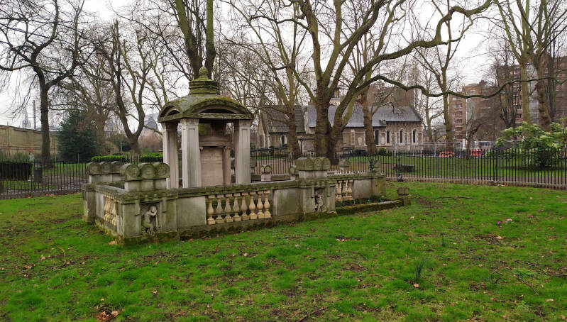 Erected by the grateful village folk for his service to the community over a period of 60 years. Born in FORGARSHIRE, arrived in DULWICH as a young surgeon in 1815, becoming the assistant of the established practitioner. In 1832, he f. the PROVINCIAL AND SURGICAL MEDIC AL ASSOC., and, later, in 1836, the WEBSTER MEDICAL ASSOC., with the first meeting in the EXETER HALL. precursors of the BRI.MED.ASS. Rest 1977 (Silver Jub) bar DUL.SOC.